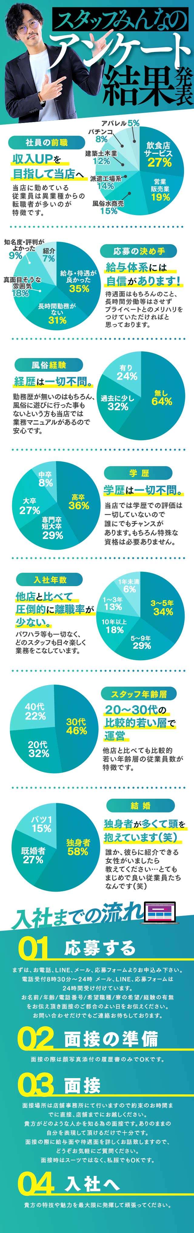 | A | 20代:30% 30代:45% 40代:25% 年齢に関係なく、体力とやる気があればしっかりご活躍いただけます! |