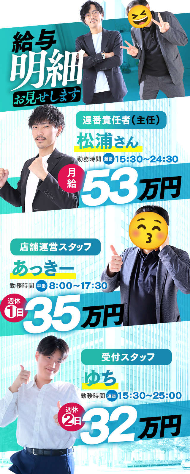 実際に面接したりお問合せ頂いたときに、「日払いは可能ですか?」という声をよく聞きます。当店は、こちらのご要望にも応えていますのでご安心ください。