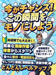 全く問題ありません!専門的な知識は一切必要ありませんし、最初はカンタンなことから少しずつ覚えていただければ大丈夫です。 優しい先輩スタッフが丁寧にサポートしますので、どうぞ安心してくださいね! |