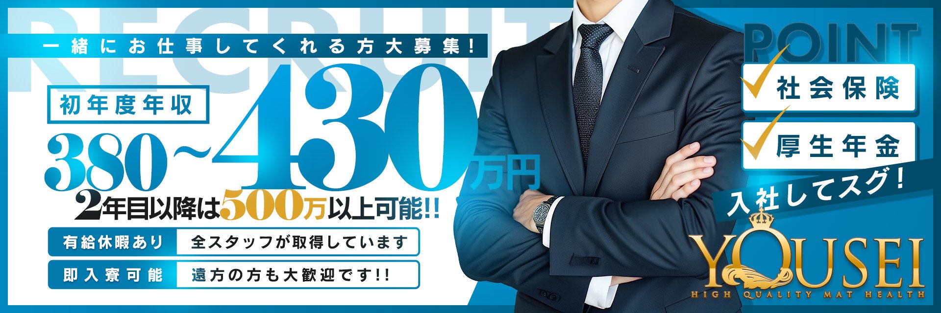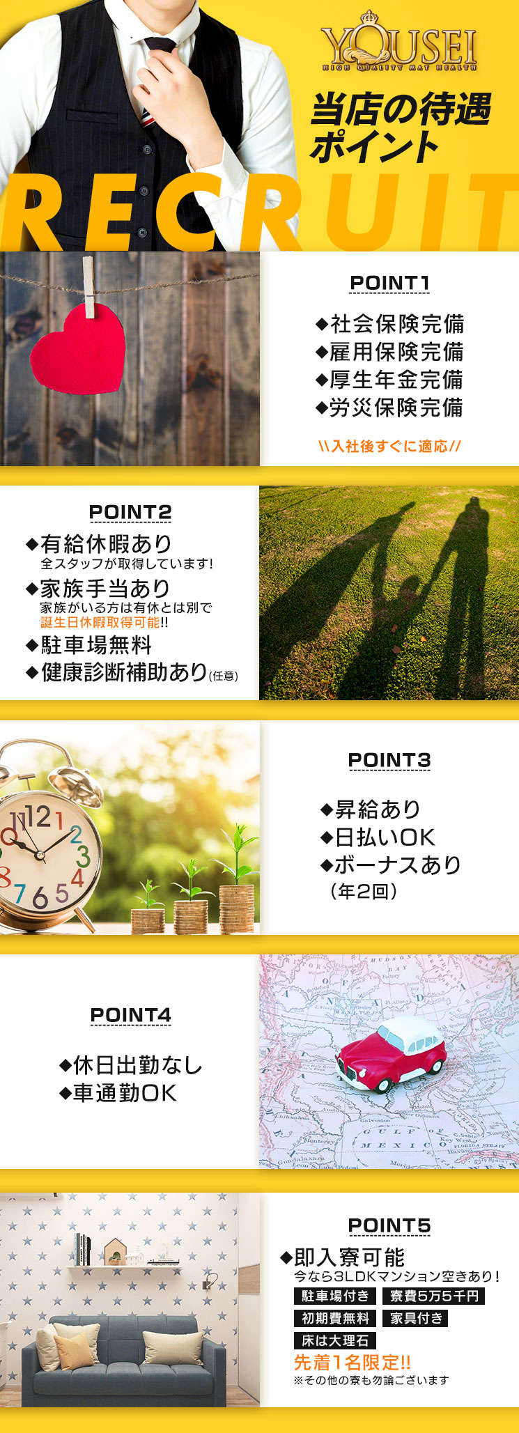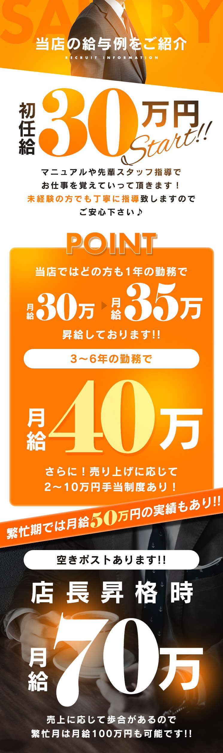 社会保険・雇用保険・有給休暇など他の風俗店にない待遇がしっかりとしているのでありがたいです。給料も9時間労働の週1日休みで現在1年目ですが37万円まで上がりました。これからがもっと楽しみです