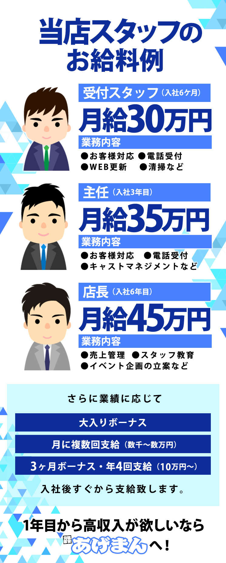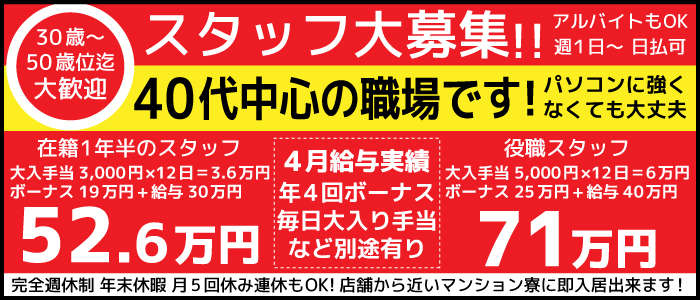 店長ブログ ≪前のページ 記事一覧 次のページ≫ 月給30万円~!採用条件は真面目に頑張れる人! 2026/03/22 19:41 あげまん 求人情報 正社員募集中!経験者も未経験も活躍できるサポート体制信頼できる先輩スタッフが丁寧に指導します月給30万円~さらにお給料とは別に毎月大入り支給 & 3ヶ月毎ボーナス支給※業績による売上好調につき、事業拡大計画進行中!これからのあげまんを担っていく人材を募集しています!経験・年齢・学歴不問週休2日制導入済み連休が取れるのでプライベートも充実♪今お持ちの不満や不安、全て『あげまん』が解決致します!まずはお気軽に当店までお問合せ下さい。 LINE応募はこちら お店に直接メールで質問する お問合せは 「ジョブヘブン見た」で! 求人情報を見る| お店サイトを見る ≪前のページ 記事一覧 次のページ≫ プロフィール ニックネーム:なかむら お仕事頑好きな方、高待遇をご用意しております! 真面目に働く方一緒に頑張りましょう! お店データ ◇店名 あげまん 西中島店 ◇業種 ホテヘル ◇勤務エリア 西中島・新大阪 求人情報を見る サイトを見る 求人ムービーを見る 最新のブログ一覧 月給30万円~!採用条件は真面目に頑張れる人! 月給30万円~!採用条件は真面目に頑張れる人! 月給30万円~!採用条件は真面目に頑張れる人! 月給30万円~!採用条件は真面目に頑張れる人! 月給30万円~!採用条件は真面目に頑張れる人! カレンダー << 3月 >> 日 月 火 水 木 金 土 1 2 3 4 5 6 7 8 9 10 11 12 13 14 15 16 17 18 19 20 21 22 23 24 25 26 27 28 29 30 31 アーカイブ 2026年03月 ( 29 ) 2026年02月 ( 28 ) 2026年01月 ( 31 ) 2025年12月 ( 2 ) 関連の求人 服装自由/ 正社員/ 中・高齢者歓迎/ 昇給あり/ 寮・社宅あり/ 学歴不問/ 週休2日制/ 週5日以上/ 西中島・新大阪/ 髪型自由 SNS応募方法 あげまん 西中島店様のSNSID 63060845 IDをコピーしてお気軽にお友達追加♪ SNSサービスから上のIDにお問い合わせください。「ジョブヘブンを見ました」とお伝えすると対応がスムーズになります。 お電話・メールから応募する場合 電 話 0120-093-097 メール rec@age-m.net 採用担当: なかむら 受付時間: 9:00~17:00 閉じる