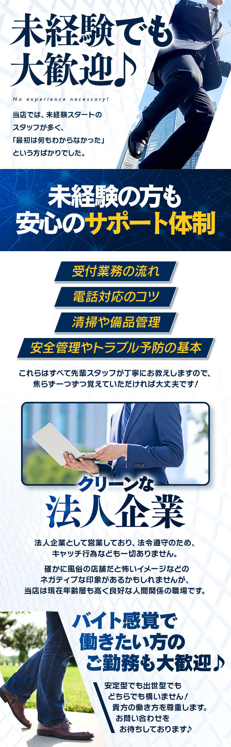 法人企業として営業しており、法令遵守のため、キャッチ行為なども一切ありません。