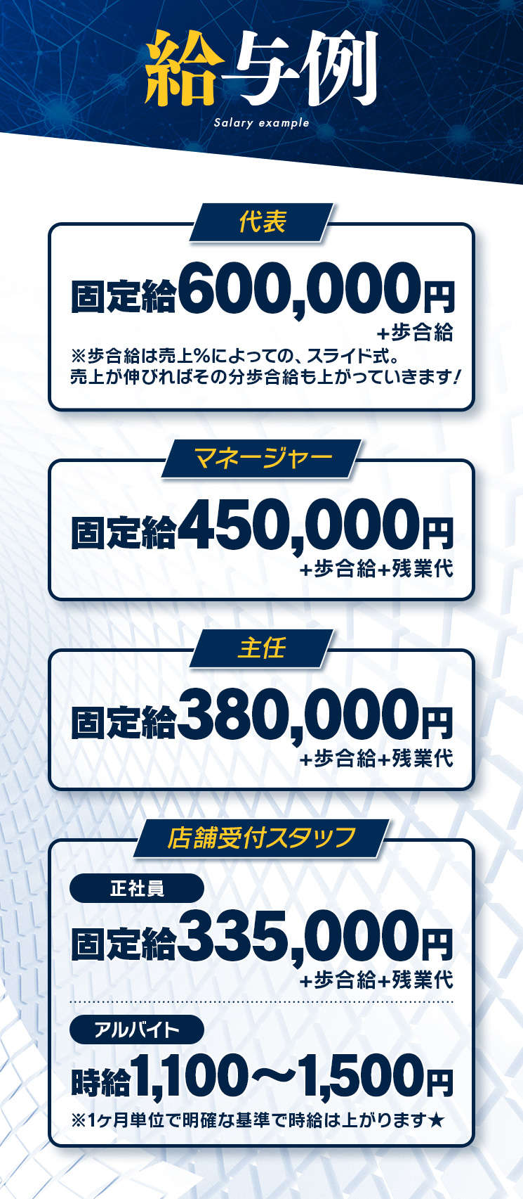 固定給450,000円〜+歩合給+残業代