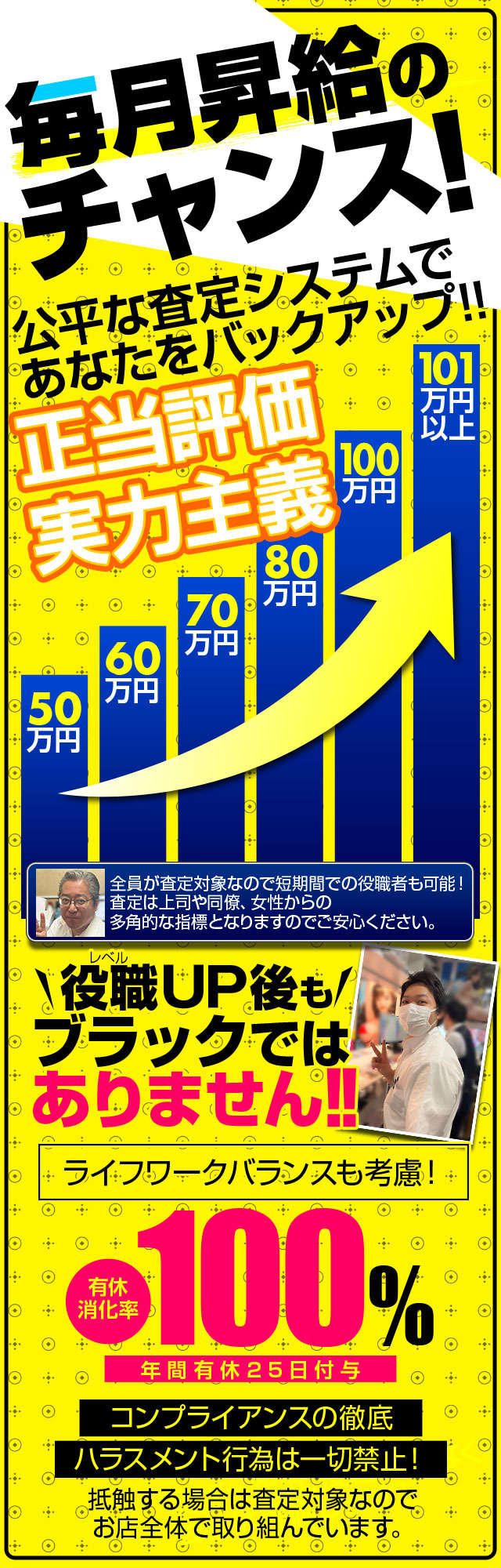 完全実力成果主義毎月必ず査定があります。多角的な視点と意見から正当な評価が約束されています。一生懸命...