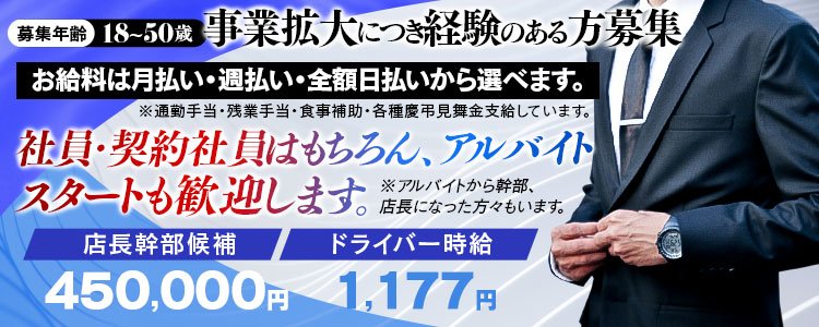 当店は 関西・近畿(大阪・堺・和歌山・奈良)のエリアで事業拡大につき、 幹部・店長候補及び店舗運営スタッフ・コンパニオン送迎ドライバーを広く募集します。 社員・契約社員はもちろん、アルバイトからのスタートも歓迎します。 ※アルバイトから幹部・店長になった方々もいます。 要はあなたの「やる気次第」です。 弊社は「ピンチをチャンスに変える」アツい人材を希望します。 お給料は月払い・週払い、全額日払いから選べます。 ※通勤手当・残業手当、食事補助・各種慶弔見舞金支給しています。 弊社は年齢・学歴、経験等一切問いません。 若さを活かしてガムシャラに働くも良し。 亀の甲より年の劫で臨機応変に働くも良し。 コツコツ・真面目だけが取り柄なら尚良しです。 弊社の社訓は「凡事徹底」 しっかりした基礎は高みを目指す柱になります。 ブレない姿勢を高く評価します。 事業拡大につき様々な経験のある方々を広く募集します。 |