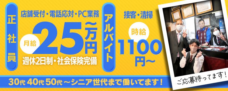 ■対面接客・受付業務 お客様からのお問合せや来店されたお客様の案内を行っていただきます。 予約の確認や、会計作業、注意事項の喚起などをお願いします。 簡単なマニュアルや、先輩スタッフに付いて業務内容を見ながら徐々に覚えていただきますので、未経験の方でも安心して働けます。 ■PC更新業務 ヘブンネットなど、ポータルサイト等の店舗情報更新作業を行っていただきます。 キャストの出勤情報やイベント、求人ブログの作成となります。 基本的にはボタンを押すだけや、ブログの更新時に簡単に文字が入力出来れば問題ありません。 PCが苦手な人でも簡単にできます。 ■清掃・備品管理 お客様やキャストの方に快適にお過ごしいただくため、店内の清掃や備品の管理・補充を行っていただきます。 |