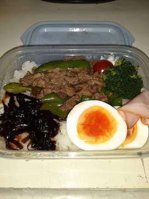 ご飯にお肉、野菜、ゆで卵など、バランスを意識した内容です。